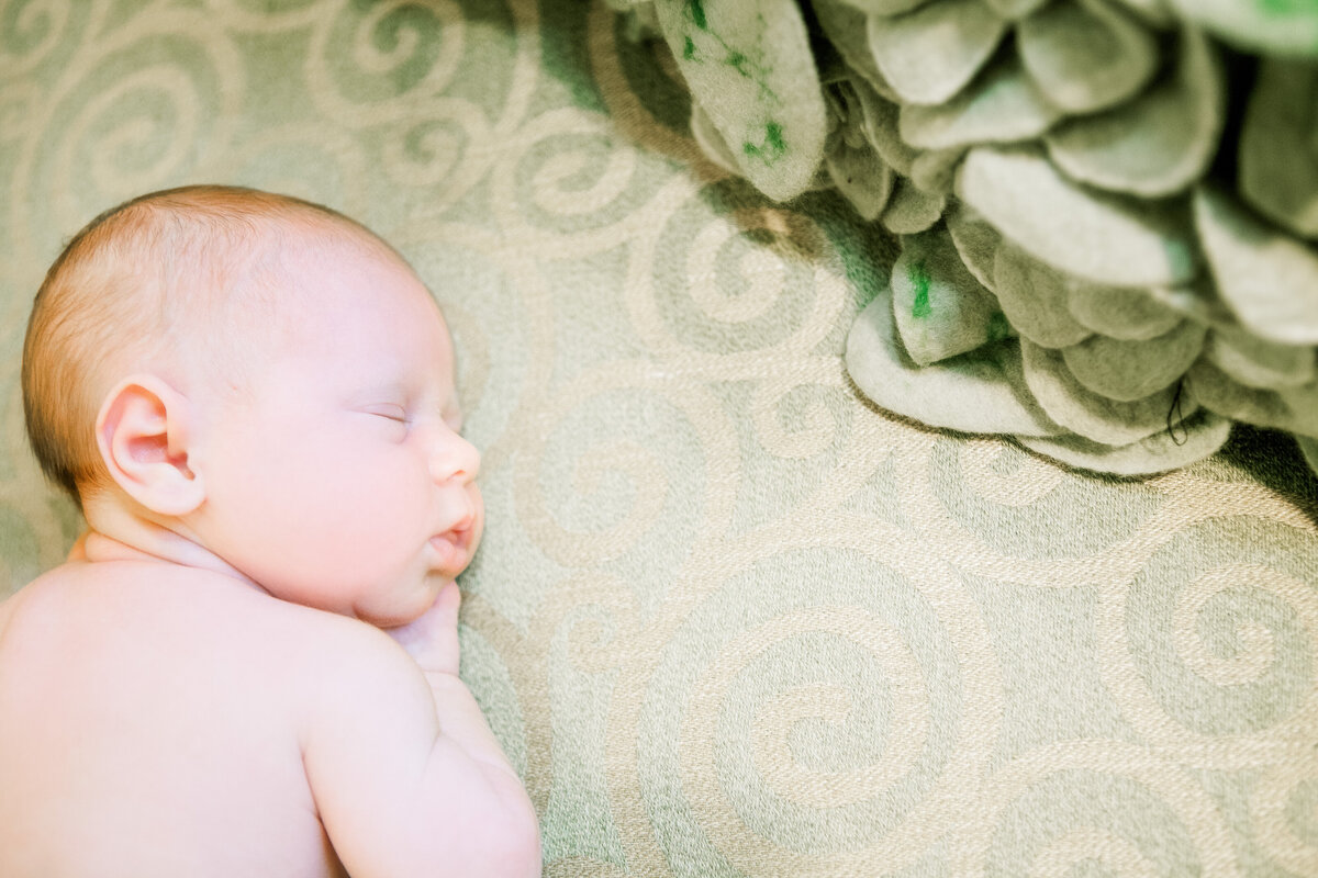 Ideally, newborn sessions should take place in the first 6-10 days of life to capture the fresh newborn look, with day 6 being the optimal time for curly poses. In these first few days the baby stays in deep, peaceful sleep for longer so they can be moved easily between a variety of poses.
